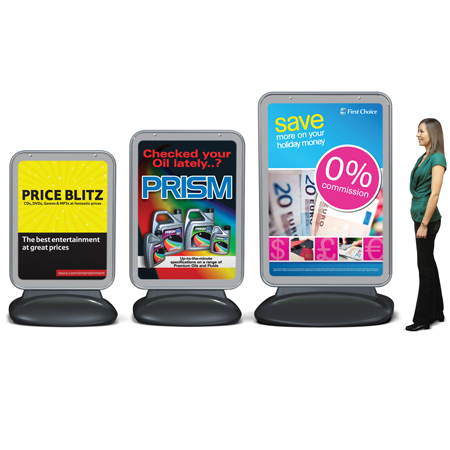 Stylish snapframe forecourt sign in a range of poster sizes. Front-opening aluminium snapframes for quick and easy poster change. Water-fillable base with built-in wheels and carry handle.